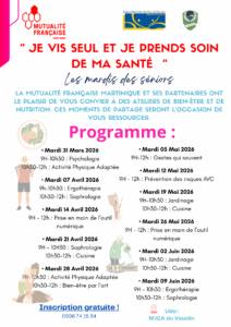 - Cuisine diététique : les participants découvriront comment adopter une alimentation équilibrée, adaptée aux besoins des seniors et valorisant les produits locaux.